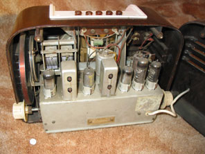 Shown above is the DAC10, which uses a very similar circuit and chassis to the DAC90A but with the added luxury of pushbuttons. The set works on AC or DC and uses 4 valves plus rectifier. This model is almost as collectable as the DAC90/A discussed on the previous page. Particularly striking are the ribs that go around the cabinet and form the speaker grille. The ribs were also used famously in the TV12/TV22 bakelite televisions from the same period, itself now a desirable television. Like the DAC90/A minor production differences appeared during the life of the model. For instance the tuning scale and pushbutton surround can be either cream or white, and is extremely vulnerable to impact damage, causing cracking around the pushbuttons where the plastic is thinner. The pushbuttons are sometimes brown, and sometimes mottled “tortoiseshell”. Two of the pushbuttons were used for wavelength selection (MW or LW), with the remaining three pushbuttons used for MW station selection. In later models one of the three MW station selection buttons was used for the “Light” program on long wave. The pushbuttons are tuned with pots at the base of the set, that can be accessed once the bakelite back and a small piece of pressed card is removed. Shown below are the tuning adjustment pots, and to make it easy to retune a pre-set, small metal plates marked with the wavelength give a guide to the desired station position depending on the physical position of the pot shaft. Like the DAC90/A, perhaps one reason the set is considered desirable is that the marbling or mottling of the bakelite is very pronounced, and so looks very pleasing to the eye. A specially designed loudspeaker was used in the set, with the magnet inverted inside of the cone such that the speaker is very slim. Therefore if the speaker fails a speaker from a different scrapped set cannot generally be used. The bakelite moulding incorporates a recess centrally behind the tuning scale so that the set may be picked up with one hand and moved with ease. Valve line-up is UCH42, UF41, UBC41, UL41, UY41, the receiver cost £14.16.0 subsequently reduced to £13.9.8, both plus p.t.