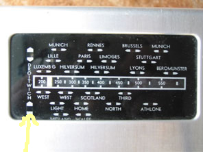 Shown on this page is the "Deccette" from 1953. Like many other radios featuring this cabinet shape, this set is often referred to as a "toaster". Other radios that have gained that shorthand description include the Ekco U159, Murphy A100 and K.B. FB10. The Deccette is the radio that turns up least often nowadays. Unlike the others mentioned above, which worked only from mains power, the Deccette was primarily a battery receiver for which an optional matching mains power unit could also be purchased. The battery-only receiver operated from two all-dry batteries, the B101 supplying an H.T. of 67.5v and an AD35 supplying 1.5v L.T. The same battery set could operate on mains by use of the AC power unit that the receiver was designed to stand on. To operate the radio from the mains the receiver is carefully placed on top of the mains unit so that the connector plug in the power supply engages in the socket in the base of the receiver. (See picture below far right). Setting the radio onto its power supply automatically disconnects the internal batteries and converts the receiver to mains operation. The socket is not strong enough to support the weight of the power supply, so if the receiver is being moved using the built-in carrying handle the power supply would need to be supported from underneath too. The power supply unit incorporated its' own on-off switch, and a pilot light. H.T. current was supplied by a Westinghouse U429 half-wave metal rectifier, and L.T. current supplied by a Westinghouse 16K7 full-wave metal rectifier. Receiver valve line-up is X17, W17, ZD17, N19. The receiver was essentially designed for M.W. reception only, but by tuning past the lowest wavelength end of the scale to the Droitwich calibration mark (yellow arrow picture below left), a switch opens bringing a L.W. preset tuning position into operation. The receiver is notable for being one of the first sets to use a ferrite rod aerial, comprising of two coils wound on an iron dust rod. These were far easier to incorporate into a portable radio chassis than the frame aerials (usually wound internally round the cabinet) that had been used until then. The cabinet construction is quite complex, and servicing is made tricky due to the number of dismantling steps required to get at the chassis. Some of these steps require levering of the plastic panels, which obviously presents a risk as the cabinet parts become brittle with age. The cabinet is made of quite a selection of materials, including plastic, bakelite, metal, wood, rexine and Perspex. The "slats" protecting the speaker are particularly prone to bits chipping off. As the only radio able to operate from either mains or battery it was the most versatile of the "toaster" models marketed by various companies, but is definitely the least common. One of the chief reasons for this must be the original price. Costing £12.13.7 +pt it was very expensive in 1953, and the optional power unit cost an additional £5.5.0 +pt.