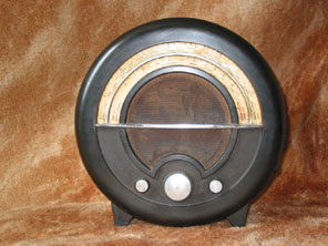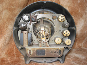 Shown here is the Ekco AC76, the first of the "round" Ekco receivers designed by Wells Coates on the classicwireless site. The very first "round" Ekco was the AD65 from 1934, the AC76 from a year later was the second in the series. The cabinet design is similar, sporting a semi-circular tuning scale in the top half of the cabinet. A horizontal bar protects the large expanse of speaker cloth. This is the much rarer black and chrome cabinet, though the set also came in mottled brown bakelite. Unlike the Ekco AC85 seen already and the AC86 on the next page, this particular example has not as yet undergone restoration. However as may be seen it is completely original inside, even the paper block electrolytics are still remaining. This receiver will be rebuilt concealing new components within the old capacitors and rebuilding them as seen on the AC85 and AC86. This receiver came to form part of the collection as a result of this site, so I have some idea of its history. It was originally bought in Plymouth, and remained there in the same family for all its life until recently. It was used as a kitchen radio until the 1960s. During WWII it was kept on the fireplace mantel and used to follow the latest wartime news. Since Plymouth was an important military naval base at the time the area drew attention from overhead bombing, and one such localised explosion blew the radio off its position on the mantelpiece. Perhaps giving a lie to the vulnerability of bakelite the cabinet survived intact, though regrettably one of the family resident in the house at the time lost their life during the raid. The radio is quite easy to work on, as the entire chassis including speaker can be removed from the cabinet as a single assembly. Like the AC85 already seen, the AC76 incorporates a Noise Suppressor control. This control is to the right hand side of the cabinet placed lower down so that it does not detract from the appearance of the receiver. The control is continuously variable, and the knob is calibrated "Strong", allowing only the most powerful transmitting stations to be tuned in, as it applies a lot of suppression. The purpose of the control at that position is to suppress weaker stations and local noise, so only stations capable of overwhelming local noise would be received. As the control is advanced to the "Medium" position a greater choice of stations would be heard, this position being intended for areas of reduced local noise (e.g. no adjacent tram tracks or refrigerator compressors). At the "All Stations" position at the far end of the control's travel minimal suppression is applied, so all stations as well as any local noise would be heard. The receiver offered sockets for an extension speaker, and also for a gramophone pick-up. The cabinet is larger than people often imagine it to be at 16 ½" x 10". It cost £12.1.6 in black and chrome as shown, or £11.11.0 in mottled "walnut" brown. Valve line-up is FC4, AC/VP1, V914, AC2/PEN, UU3. Continue to the Ekco