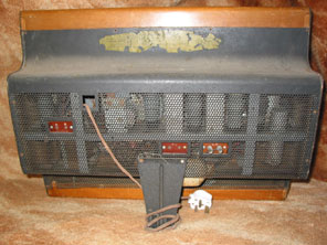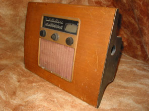 1946 saw the introduction for the first time of the “Baffle” receiver pioneered by Murphy Radio. Murphy believed that the wooden or bakelite boxes that radio receivers were currently built into produced a “boomy” or “boxy” sound, and this effect could be reduced if the set were not enclosed. To this end the receiver was built with cabinetry only to the front of the set, and the side profile shows the panel curvature and how narrow the set is. The back is made of shaped perforated steel sheet. Another “new” feature was the method of optically projecting the wavelength of the short wave band onto a window within the tuning scale. The originality of this particular development was somewhat questionable, as a very similar system had been employed by Ferranti in the 1930’s. The receiver produced a good sound though, and was one of the first good quality receivers available following the war. However, it was quite expensive costing Ł25.0.0 plus purchase tax.