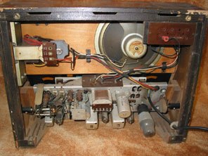 below left. The concept of using a metal rectifier rather than rectifying valve was not particularly successful, and did not appear again after the ‘182 and ‘212 series, (except in portables). The photograph of the inside of the set gives the impression that access for servicing is very good, as the back cover extends to the underside of the receiver. However this is not really the case, as the discrete components like resistors and capacitors are not available to the serviceman as they are still “under” the chassis facing the tuning scale.