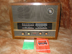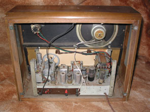 1955 was the first year of VHF FM broadcasting, and Murphy rose to the challenge of producing quality receivers to exploit the improved sound quality available from the new transmission standard. After a couple of years of producing fairly uninspiring sets the new models for 1955 brought an emphasis on design and quality back to the company. The A242 shown above was quite expensive costing nearly £37 including pt, but the set was bigger than its equivalent A212 from the previous year and the FM reproduction was very good. The A242 makes use of gold decoration to the cabinet, e.g. on the inserts to the knobs and on the tuning scale. The use of gold had suddenly become rather popular in 1954 and 1955, and several manufacturers used it on their receivers. Murphy also brought back the magic eye again, and together with the extra two valves required for VHF this meant the A242 had some nine valves (including rectifier and tuning indicator). From a servicing point of view this chassis was excellent, as the metal loops at either end of the chassis allow the chassis to be stood upside down thereby allowing easy access to the components underneath. Valve line-up is 6L34, EC92, 6C9, 6F15, 6D2, 6LD3, 6P1, 6M2, UU9. Continue to
