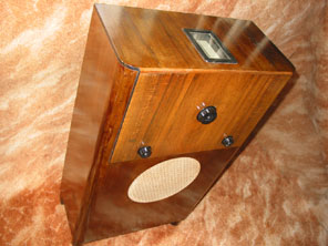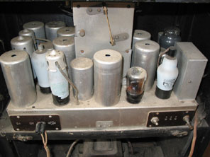 Shown here is the Murphy A28C console receiver. This is the only console receiver pictured in all the Murphy pages on this site, and there are particular reasons for this, notably because the A28C was available only as a console, there being no table version. Most console receivers in the Murphy range over the years employed the same chassis as the table receiver(s) for that year, but housed in a floor standing cabinet with improved speakers etc. However, the A28C featured 8 valves plus rectifier, instead of the more common 4 valves plus rectifier found for instance in the table model A26 of the same year. Chassis views are shown below this text. The A28C was really quite expensive at £21.15.0, some twice the price of the A26 table model of the same year. Also available was the A26C console receiver at £21.15.0, (which was a version of the A26 table model). Therefore the purchaser had paid about 50% more for the added refinements offered by the A28C over the A26C. The attention to detail is very good on the A28C though. The tuning scale is really rather restful, backlit in a red glow, but takes 5 lamps to illuminate. The speaker, pictured above right, is massive (notice the pound coin for comparison), just looking at it you know the sound quality will be good. At the back of the receiver is a metal pocket for keeping the station chart supplied with the receiver in place, such that it is out of sight, but where the booklet can be easily found if required. The metal pocket is tastefully finished in a black crackle-paint finish, even though it is at the rear of the receiver. Murphy was so confident that the tonal reproduction of the receiver was near perfect that no tone control was fitted to the front of the receiver (even the A26 table model at half the price had variable tone control). All that is available on the A28C is a push/pull switch at the back of the receiver, and the instruction booklet emphasises it may be used to reduce interference and background noise. Console versions of table receivers like A26C and A30C do turn up on occasion, but the receivers available only as console sets like the A28C and A40C are rather rare now, as they were outside the price range of most buyers.