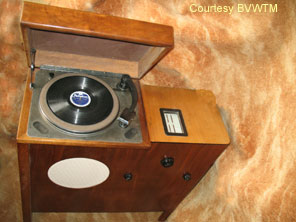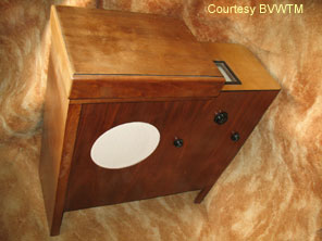 The A28C console described on the previous page was also available as a radiogram with a Garrard single play deck on metal copper anodised base plate. Unlike most radiograms where an incorporated top lid covered all radio and gram elements, the A28RG lid covers only the gram section of the instrument (see picture below left). The cabinet is a typical uncompromising R.D. Russell design, with some Art Deco leanings (note the solid square-finished post to the left upright of the cabinet and curved radius between the front right and side vertical of the cabinet). But it is in fact rather a brutal cabinet, with the large expanse of unrelieved veneered wood to the front with a circular grille cloth for the loudspeaker no bigger than the speaker itself. The A28C and A28RG are notable as being the first Murphy receiver range to feature station names on the tuning dial, in fact the model A30 from a year later still did not feature stations on the dial. The dial on the A28C and A28RG is specially constructed so that parallax errors are avoided when tuning, by having the cursor at the same level as the dial markings. No other manufacturer did this, and Murphy only did it for this receiver. To be realistic, it probably wasn’t worth the expense and trouble! This receiver also had other features like Noise Suppression and AVC, but is really noteworthy as being the first Murphy receiver that employed Automatic Tuning Correction, ATC. This was achieved using a Mazda AC/SP1 valve that measured any difference from the accurate IF frequency and applied an equivalent correction to the oscillator frequency thereby bringing the station into perfect reception. It is interesting operating this receiver, as the listener can hear the ATC circuitry at work, since it can take a couple of seconds to bring a station to maximum strength once the operator’s hand has left the tuning knob. Valve line up is AC/VP1, AC/TP, AC/VP1, V914, AC/SP1, AC/SP1, V914, AC2/PEN, UU3.