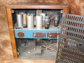 With volume and tone, wavelength and tuning controls concentrically mounted as pairs on the front, the A48 cabinet is maybe not as easy on the eye as the A46, a comment that might also be applied to the next set up the 1938 range, the A50, with its smoked mirror glass tuning surround. Notice that the chassis to the A48 is mounted in the top half of the cabinet, with the speaker located beneath it. Although not too clear from the compressed photographs above, it is encouraging that both chassis are deeply coated in dust (about 1/4 inch in both cases). This suggests that the sets have not been "messed about with" by inexperienced restorers. Valve line-up is AC/TH1, AC/VP2, HL41DD, AC5/PEN, UU4. Continue to