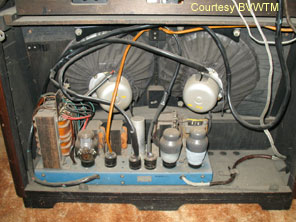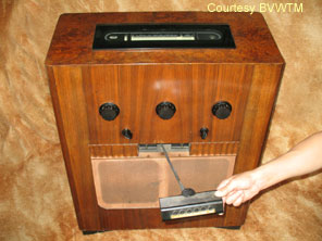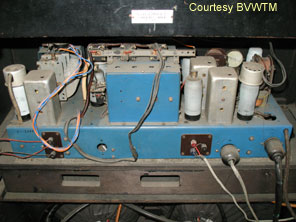 Shown above is the most expensive chassis’s available in the 1939 range, that of the ’78 series. This model was the special short wave performance and special reproduction model. Unlike the other models in the 1939 range, the A78C was fitted with remote control as standard. The drum tuning principle is still utilised, together with a black glass escutcheon, which to my mind is not quite as impressive as the mirrored version seen on the A40C. The remote control has already been discussed having been fitted as an optional extra to the A76. Two large chassis’s are utilised in the A78C. The tuner chassis (pictured below left) is housed at the top of the cabinet. The chassis at the base of the cabinet (pictured below right) carries the power components and rectifier, together with a pair of PEN45’s in push-pull configuration. The PEN45’s in push-pull deliver the sound through a pair of loudspeakers on angled baffles, which radiate the sound into the listening room in two slightly differing planes thereby ensuring maximum penetration. There are no known surviving examples of the A78RG (unless you know different – in which case email me!). Although a very impressive receiver, the A78C is considered to sound inferior to the A40C from two years earlier.