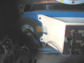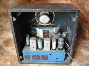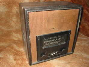 Shown above is the A90 receiver. Here pushbuttons are utilised for wave range selection, and short wave station selection is made easier by the separate dial at the right of the tuning scale, driven by a substantial chain (close up of which may be seen in the picture below). The cabinet is straight sections of wood though, gone are the days of curves and high quality veneers. The cabinet is stained a dark colour, probably to hide defects in the wood and to mask the fact the panels may not necessarily match. The rippling of the black bakelite panel around the controls gives a preview of what was to come a few years later in the AD94 and A96 cabinets. The A90 remained in production for several years, though the price rose from £11.0.0 in 1940 to £14.7.6 by 1943. Purchase Tax would have been payable on top of these prices from October 1940. Valve line-up was TH41, VP41, HL41DD, PEN45, UU6. No new models were introduced in 1941 or 1942, so next receiver described is 1943.