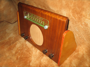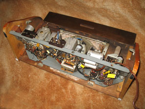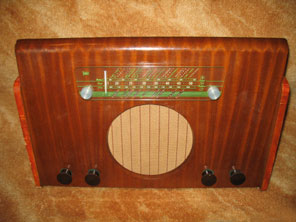 Shown above is the model U124, which along with its AC mains counterpart and the '128 series were the only new introductions by Murphy in 1948. The A124 cost £16.10.0 plus p.t. and the U124 cost £16.17.6d plus p.t. Is is usual for the Universal version to cost a little more, though in this case the extra amount in fact includes an extra valve. This is because the AC version utilises the PEN45DD valve which incorporates two diodes as well as performing the output valve functionality. The U124 utilises a 10LD11 which is just a double diode, whilst the output valve functionality is taken care of by a 10P14 which was intended for use in Universal receivers. At that time there was no suitable modern output valve available from Mazda which also included two diodes in the same envelope. The U124 again follows "baffle board" design principles, and the clever design of the cabinet and card back makes for exceptionally easy servicing. As can be seen in the two pictures below, removal of the angular card back provides access to top of chassis, along with equally good access to the underside of the chassis. Somewhat unusually, the chassis is also of a stepped design along the its length. This design involved significant extra chassis metalwork bending. The extra under-chassis space generated towards the front of the cabinet does allow the location of the output transformer under the chassis, but it must be said there is plenty of space available generally within the cabinet so it is not too obvious why the dual-height chassis was considered to be worth the extra tooling and resultant costs. The receiver is comparatively light at just 17 1/4 lbs, and Murphy have made the receiver easy to transport by providing a finger slot at the top of the cabinet to help, this finger slot can be clearly seen in the pictures below. The perspex tuning scale is also noteworthy, which allows the scale to appear to "float" across the nicely veneered front panel. Although not featured on this page, it should be noted that the AC version is fitted with an autotransformer rather than a conventional mains transformer, so it is possible for the chassis of even the mains AC version to be live. Valve line-up for U124: SP181, TH233, VP133, HL1333DD, PEN383, U403.