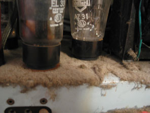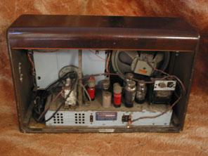 Shown here is the 7 valve plus rectifier Pye A39J/H from 1947. This is a massive receiver that is about 2 foot long, and includes a 10" loudspeaker. Other features that make this a top-of-the-range receiver from Pye include Push-Pull output using a pair of EL33 output valves and 11 wavebands, with all the short wave bands appearing band-spread. Such was the number of wavebands selectable that a mechanical indicator at the bottom of the tuning scale informs the user of the waveband currently selected. The wavebands available are as follows: LW, MW, MSW, 49m, 41m, 31m, 25m, 19m, 16m, 13m, 11m. Therefore we have a receiver for the short-wave enthusiast, and also for the high sound quality connoisseur, as the EL33's in push-pull provide plenty of high power un-distorted output. Clearly this receiver was near the top of the domestic radio price-range, but more examples survive than might be expected, probably because the A39J/H had very little competition at this position in the market. Therefore buyers who required excellent short-wave reception together with high-quality output were left with few other choices apart from this receiver at that time. I have seen it in two versions, as shown with the matt black wooden slats forming a speaker grille, and also with a cloth equivalent. I'd say the wooden slats look the more stylish, though the cloth may well have been better acoustically. This receiver could perhaps be considered a forerunner to the "International" receivers such as the PE80 that appeared in the early 1950's. Valve line-up was EF39, EF22, EBC33, ECH35, ECC35, EL33, EL33, AZ31.