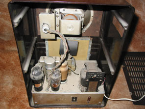 Radio Rentals commenced operations in 1930 and at first offered standard models from the Ekco range as rental receivers, but once they realised that this could form the basis of a sustainable business and rental contracts grew they started having sets manufactured especially for them. Ekco built many of these sets, and the designs were certainly very similar to Ekco models of the time, but with slightly differing cabinets. The model 694 is a four valve plus rectifier set made in about 1936, and provides for reception on medium and long wave only. This set has something of a curious chassis design. The picture left shows a view from the top, where it can be noted all five valves are squeezed into one corner of the chassis. It is not obvious to be why this may have been done, as it must have made the original assembly of the set harder, and yet there is plenty of unused spare space elsewhere on the chassis. Valve line-up is FC13C, 9A1, 10D1, 7D6, IW4/350 Continue to the Radio Rentals model 797 © COPYRIGHT RETAINED ON ALL TEXT AND PICTURES ON THIS SITE. |